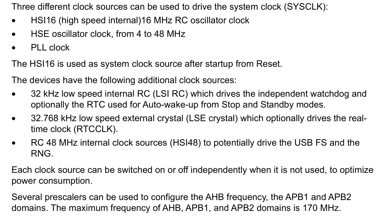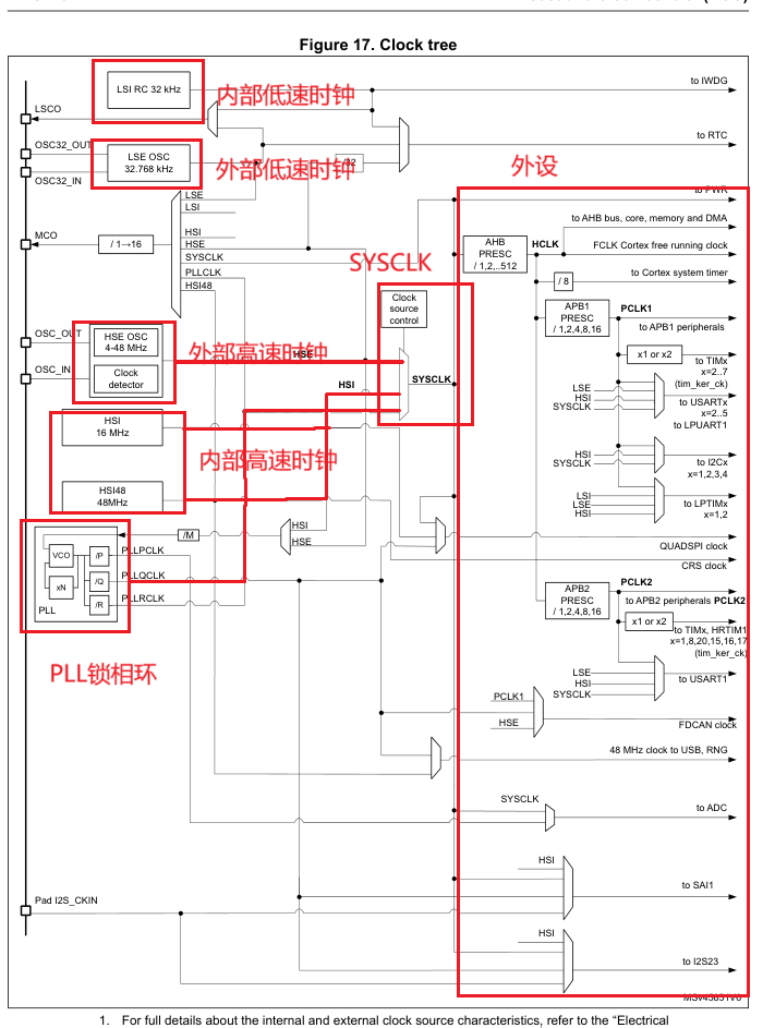 - 从数据手册可以看出,STM32系列的单片机又有四个基础时钟源,HSI振荡器时钟,LSI振荡器时钟,HSE振荡器时钟,HSI振荡器时钟,这四个时钟就是最基本的时钟来源,也就是时钟树的根,之后就是PLL锁相环和SYSCLK系统时钟。