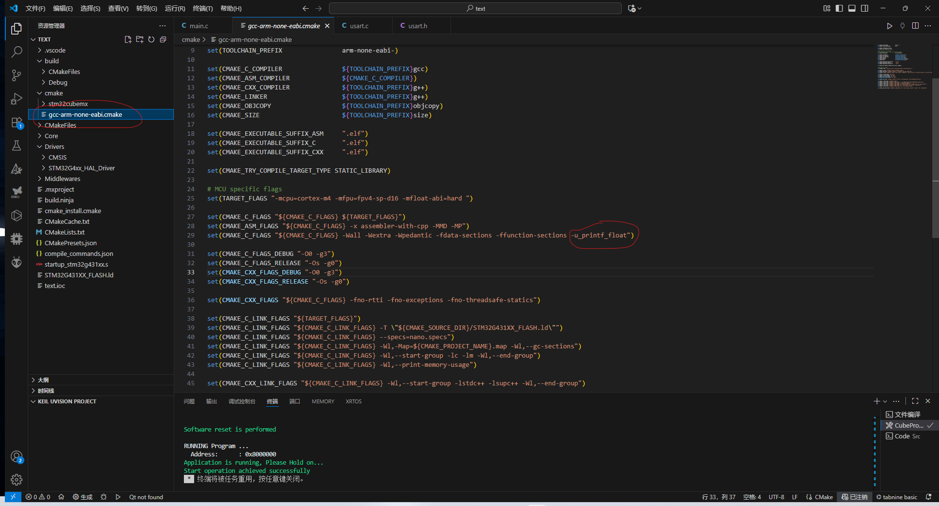 - ==注意要在gcc-arm-none-eabi.cmake文件如下位置加入-u_printf_float==