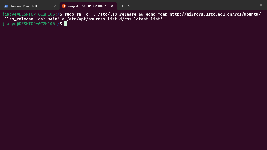 1 | sudo sh -c '. /etc/lsb-release && echo "deb http://mirrors.ustc.edu.cn/ros/ubuntu/ `lsb_release -cs` main" > /etc/apt/sources.list.d/ros-latest.list' |